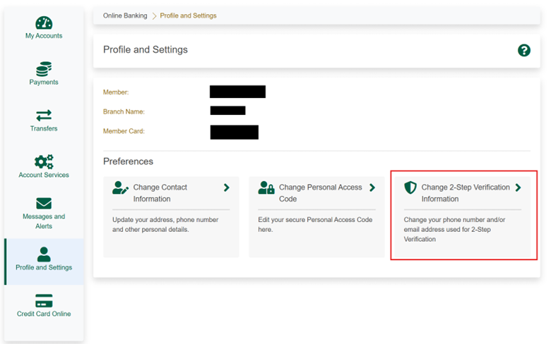 Members can go through the Profile & Settings page or through the navigation menu in Online Banking to add or edit their 2-Step Verification settings.