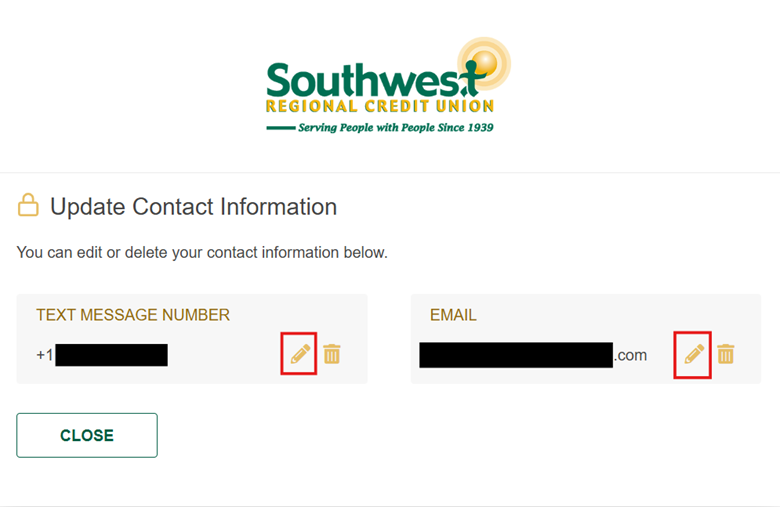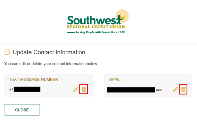 Select the delete icon on the Update Contact Information page beside the phone number or email to be deleted.