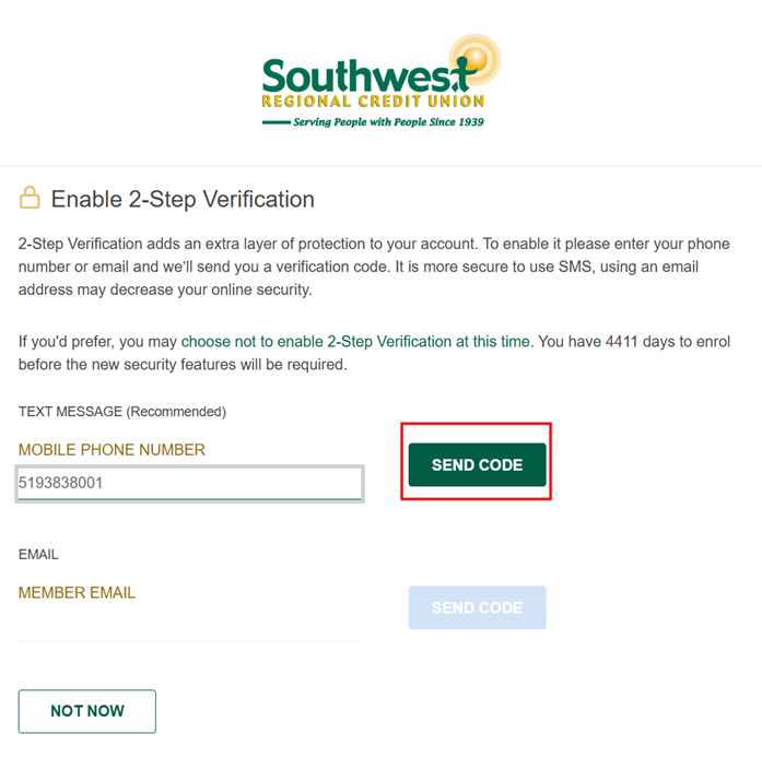 There is a grace period during which members can select a Not Now option on the enrollment page to defer enrollment. During the enrollment grace period, users who haven’t enrolled continue to be challenged with security questions during any stepped-up authentications.